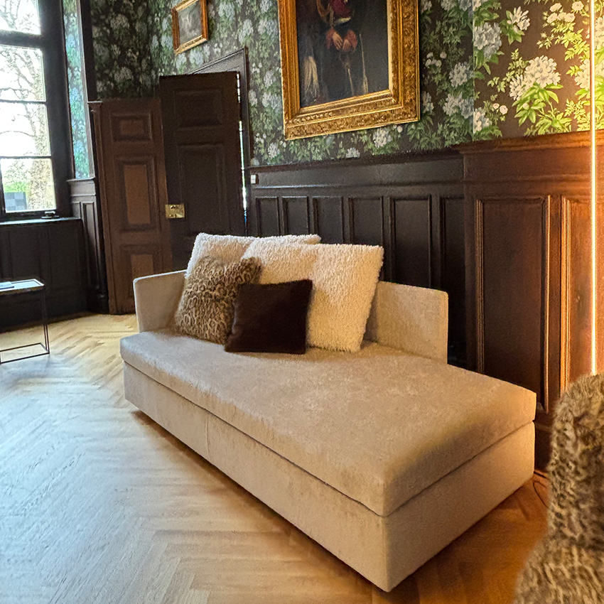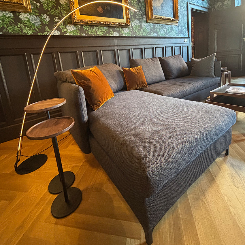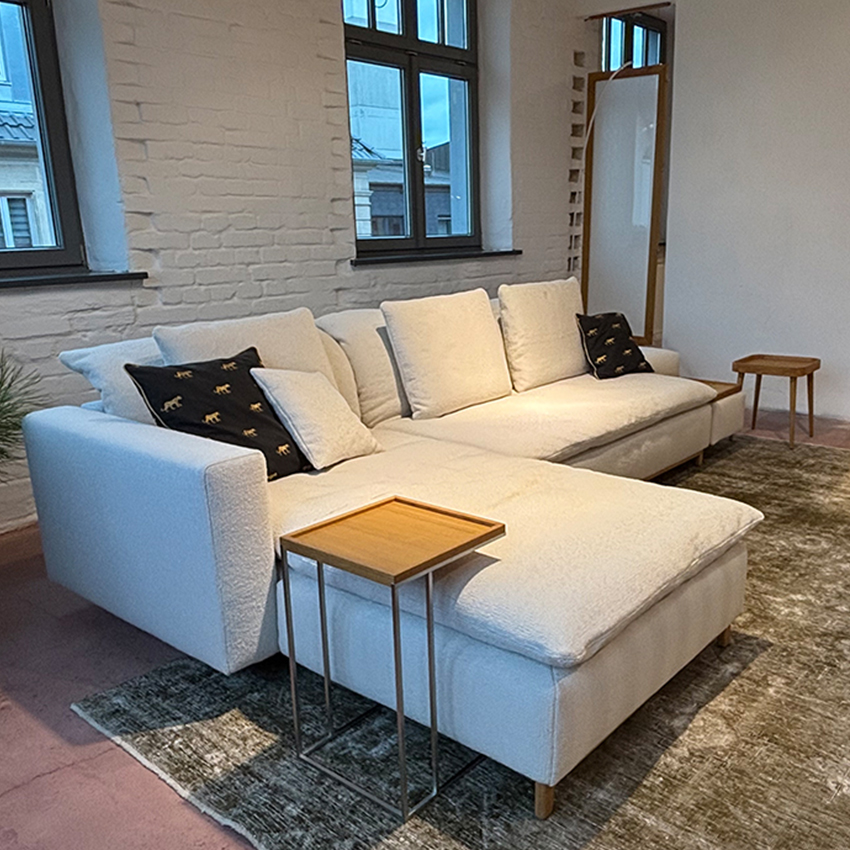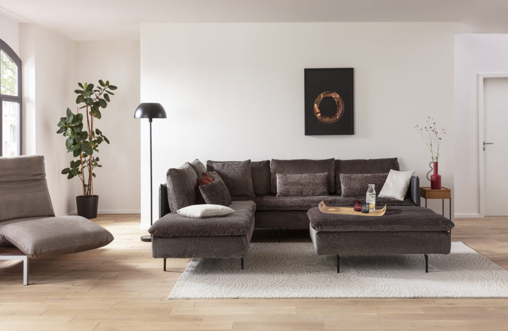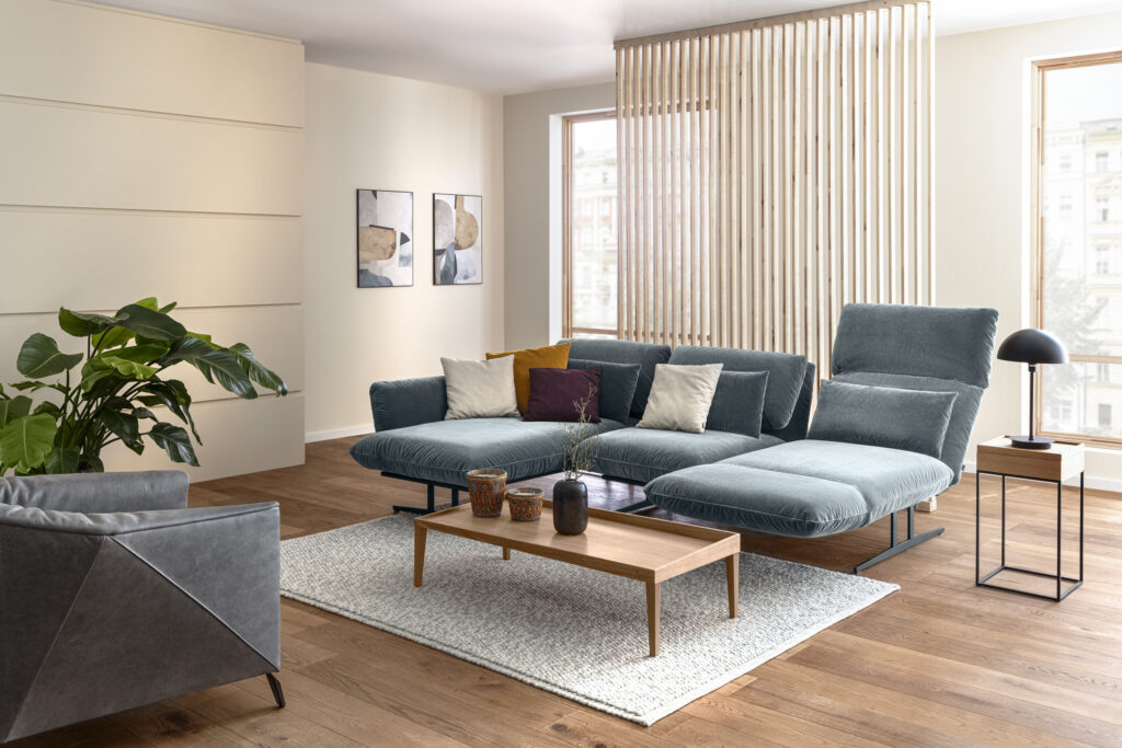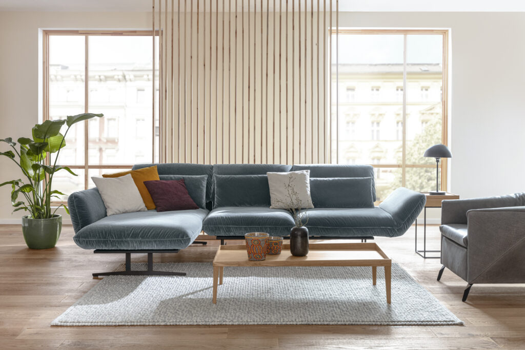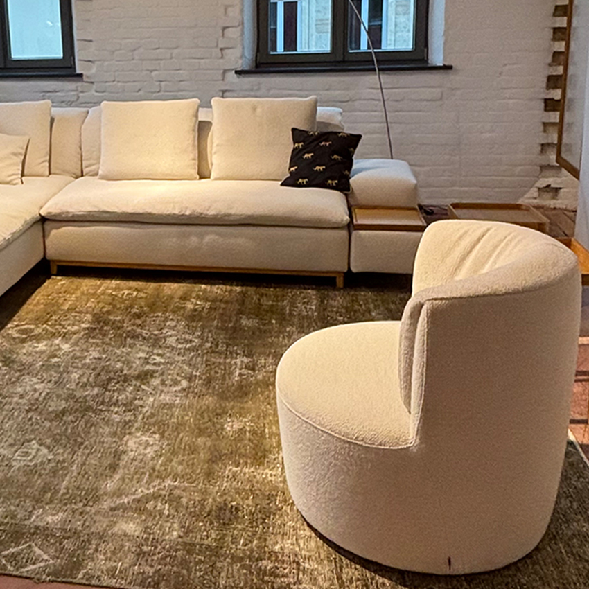 Das Sofa Giro bietet eine raffinierte Funktion: Mit einer sanften Drehbewegung lässt sich das Sitzelement nach innen schwenken, wodurch eine großzügige Relaxfläche entsteht – ideal für entspannte Stunden voller Komfort und Behaglichkeit.