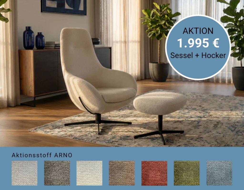 Relax-Sessel MANIRA mit Dreh- und Kippfunktion sowie Hocker bezogen im Stoff „Verona“ in 6 möglichen Farben und Gestell in schwarz zum Aktionspreis von 1.995 EUR (inkl. MwSt.).