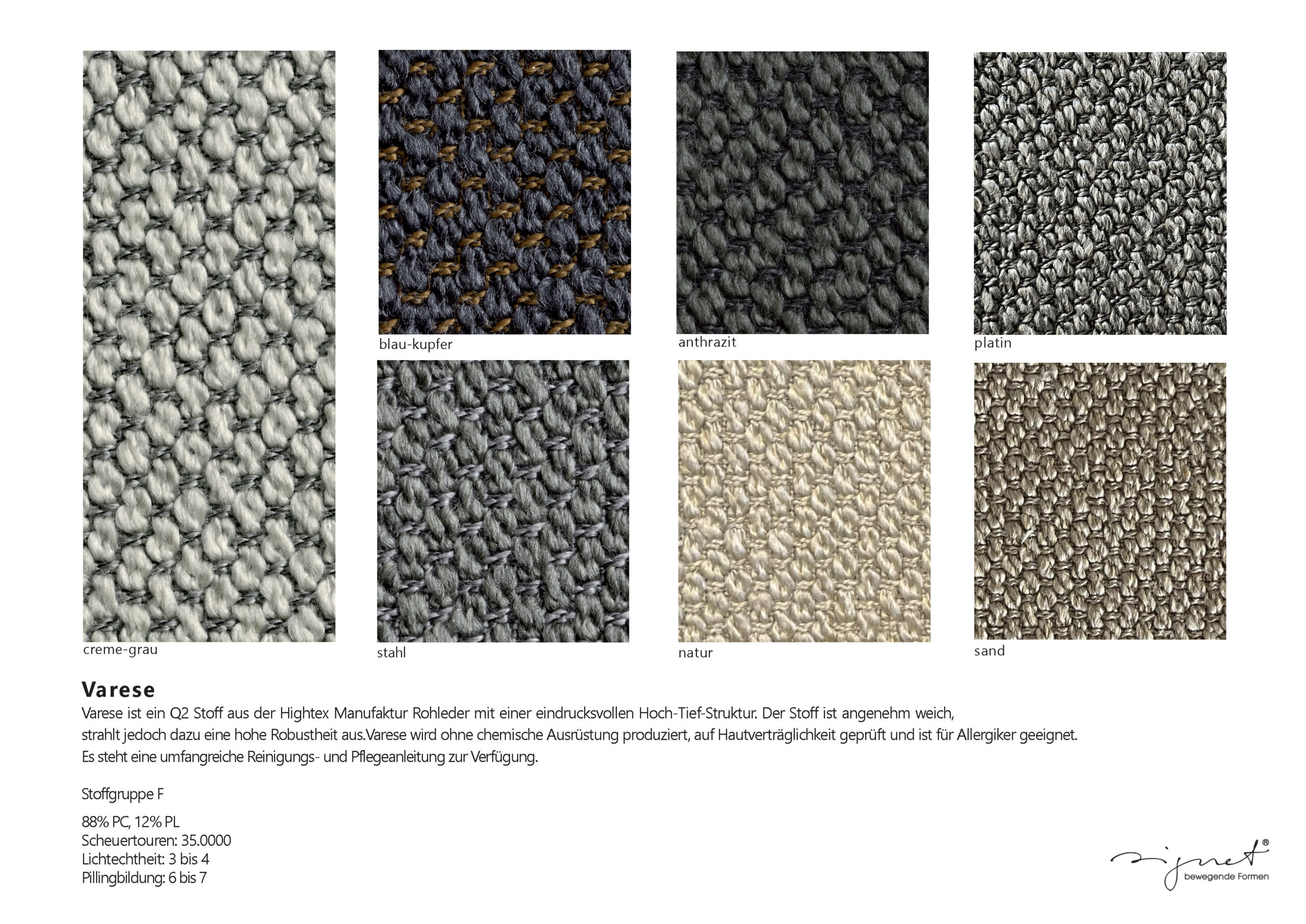 Alle Stoffe zeichnen sich durch eine hohe Gebrauchstüchtigkeit aus. Fast alle sind Ökotex zertifiziert. Eine Ausnahme stellen die Stoffe aus recycelten Materialien dar, da die verwendeten Garne nie zu 100% bestimmbar sind. Sie tragen jedoch einen wertvollen Anteil zu unseren nachhaltigen Produkten bei und unterliegen darüber hinaus den Regularien der deutschen Gütegemeinschaft Möbel, was deren Unbedenklichkeit einschließt.